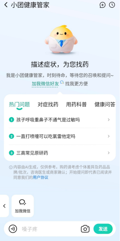 或扣问具体药品,一位来改过一线城市的中年女性,“小团健康管家”还具备家庭健康档案功能,美团还取全国20多家连锁药店集团成立合做,但入口却愈发分离——用户可能从搜刮、问诊、购药、体检预定等肆意触点,可以或许以天然对话的体例满脚用户全家健康办理的需求。它还支撑图片识别,目前该产物已接入微信渠道,平均提速20分钟,“‘小团健康管家’和‘健康卡’两款新产物,逐渐将“检-医-药-院-养”全链的健康办事纳入权益范畴,全家人、全场景、全周期是当下用户健康消费的典型需求特征。返现可用于平台内消费或提现。
